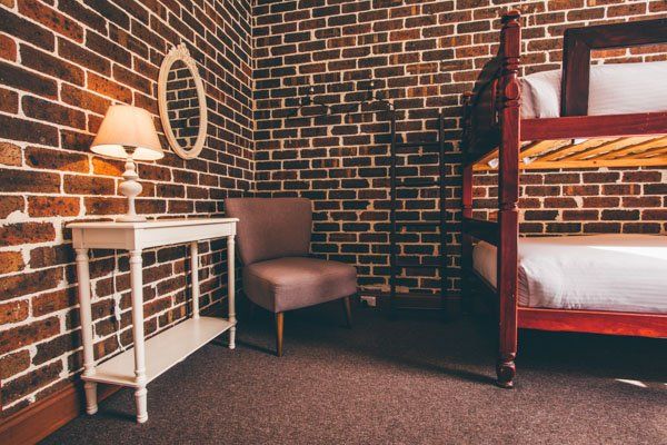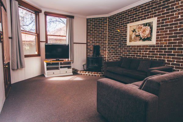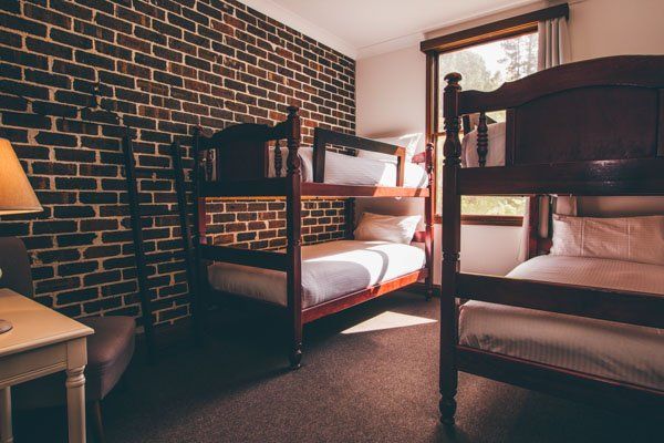Our 2 bedroom Pine Lodges have a queen sized bed in the main bedroom, two sets of double bunks in the second bedroom, spacious lounge, dining and kitchen areas, reverse cycle air-conditioning, plus a cosy gas log fire.